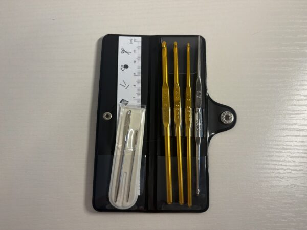 両かぎ針1/0-2/0、片かぎ針4/0、6/0、8/0号、とじ針(2サイズ)、ものさし、ケースのセットです。